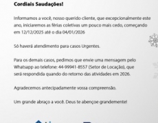 FÉRIAS COLETIVAS DE 12/12 A 04/01/26 | LocaçãoÁrea Total: 0.00 Área Construida: 0.00 R$ 8.500,00 / mês